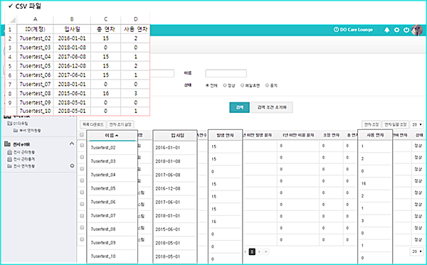 1) CSV 파일 등록을 통해 근속연수와 발생 연차가 자동으로 등록됩니다.