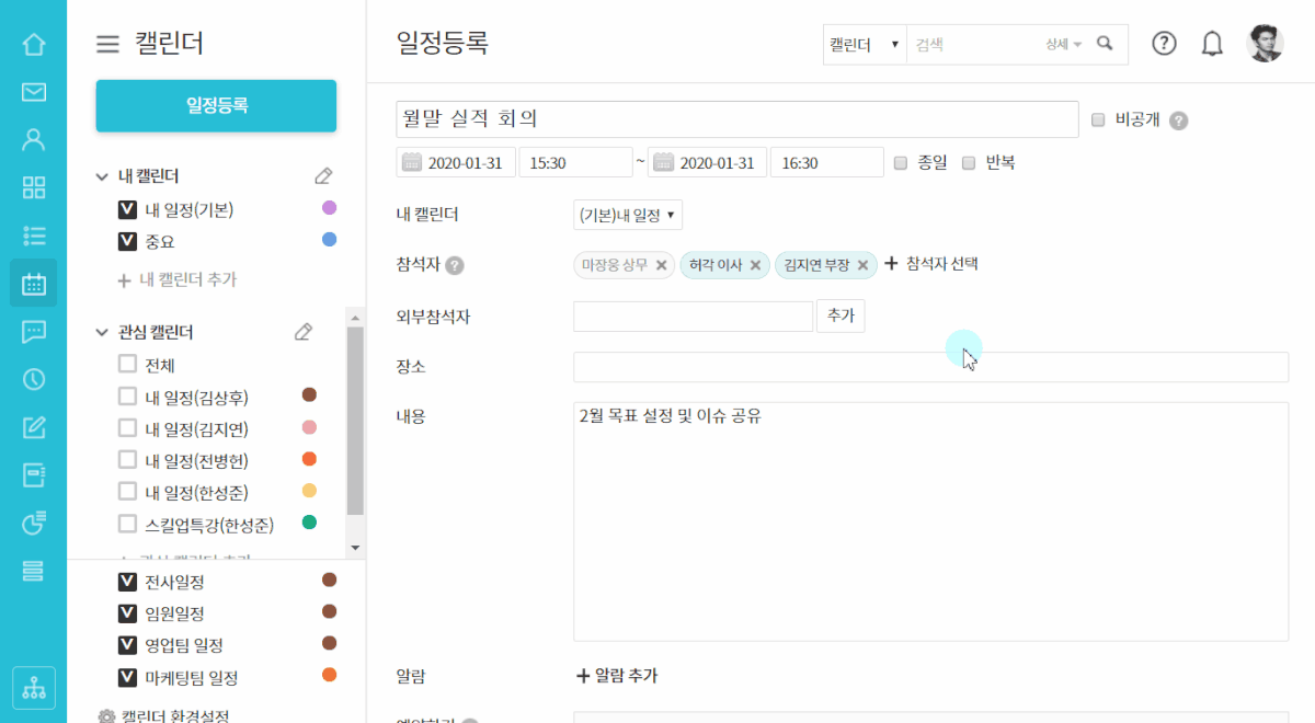 다우오피스 예약 기능의 빼놓을 수 없는 장점입니다. 캘린더에 회의 일정을 등록하면서 목적에 맞는 회의실을 예약할 수 있습니다!