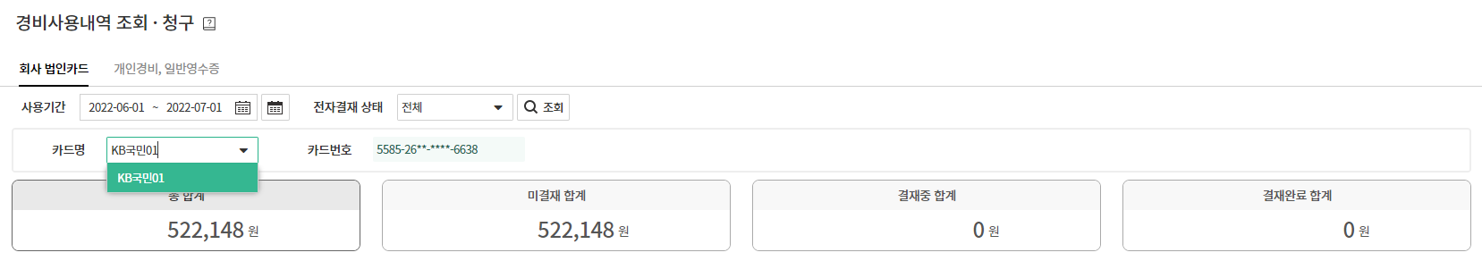 경비 사용 내역을 조회 및 청구를 할 때 회사의 법인카드 사용내역을 카드사로부터 바로 가져올 수 있습니다. 때문에 일일이 카드를 등록할 필요가 없어 시간을 절약할 수 있다는 점이 큰 장점입니다. 카드 사용자가 누락 없이 사용내역을 관리할 수 있어 업무의 생산성도 높아졌습니다!
