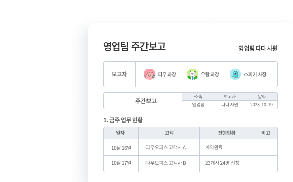 시중에 다양한 협업툴이 존재하겠지만 저희 다우오피스는 영업팀에게 꼭 필요한 협업툴임과 동시에